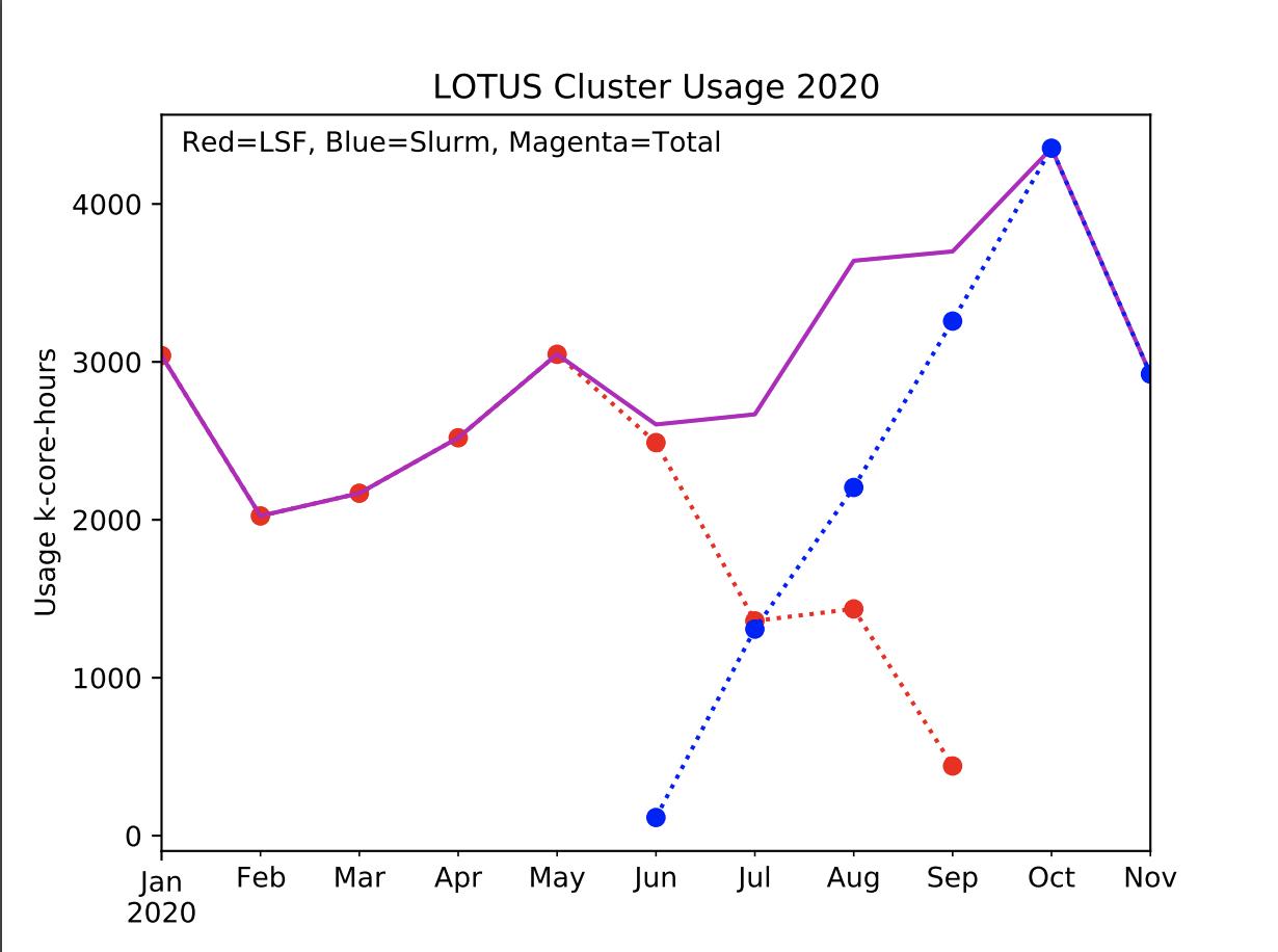 As is obvious, we have completed the transition from the LSF to the SLURM scheduler. This was an unavoidable change; the good news is that the volume of work (in core hours) has been sustained throughout the transition, and in fact now exceeds that which was being done prior to the transition: